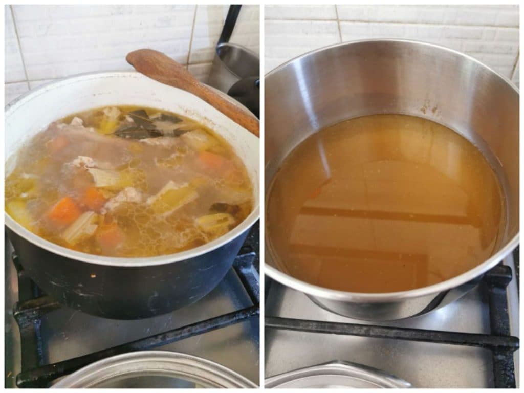 In der Zwischenzeit braten Sie in einer Pfanne eine halbe Selleriestange, eine halbe Karotte und eine halbe Zwiebel mit einem Esslöffel Öl an, fügen Sie die Knochen hinzu und lassen Sie sie gut bräunen. Dann alles mit Wasser bedecken und etwa eine halbe Stunde bei mittlerer Hitze köcheln lassen