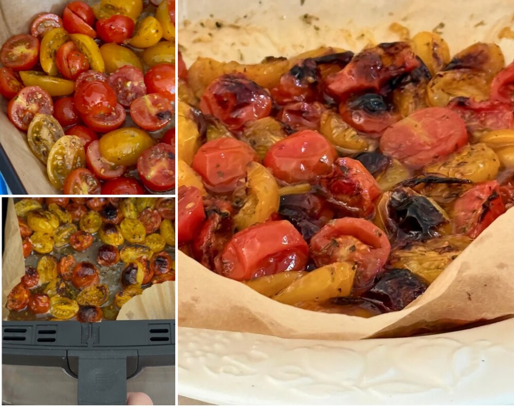 Beginnen wir damit, die Kirschtomaten zu waschen, sie auf einem Tuch zu trocknen, sie zu halbieren und auf einigen Blättern Küchenpapier zu trocknen. Legt die Tomaten auf ein mit Backpapier ausgelegtes Blech, sodass die Schnittfläche nach unten zeigt. Würzt mit Salz, Zucker, Öl, der Sauce und den verschiedenen Gewürzen und kocht sie 15 Minuten bei 180°C in der Heißluftfritteuse.