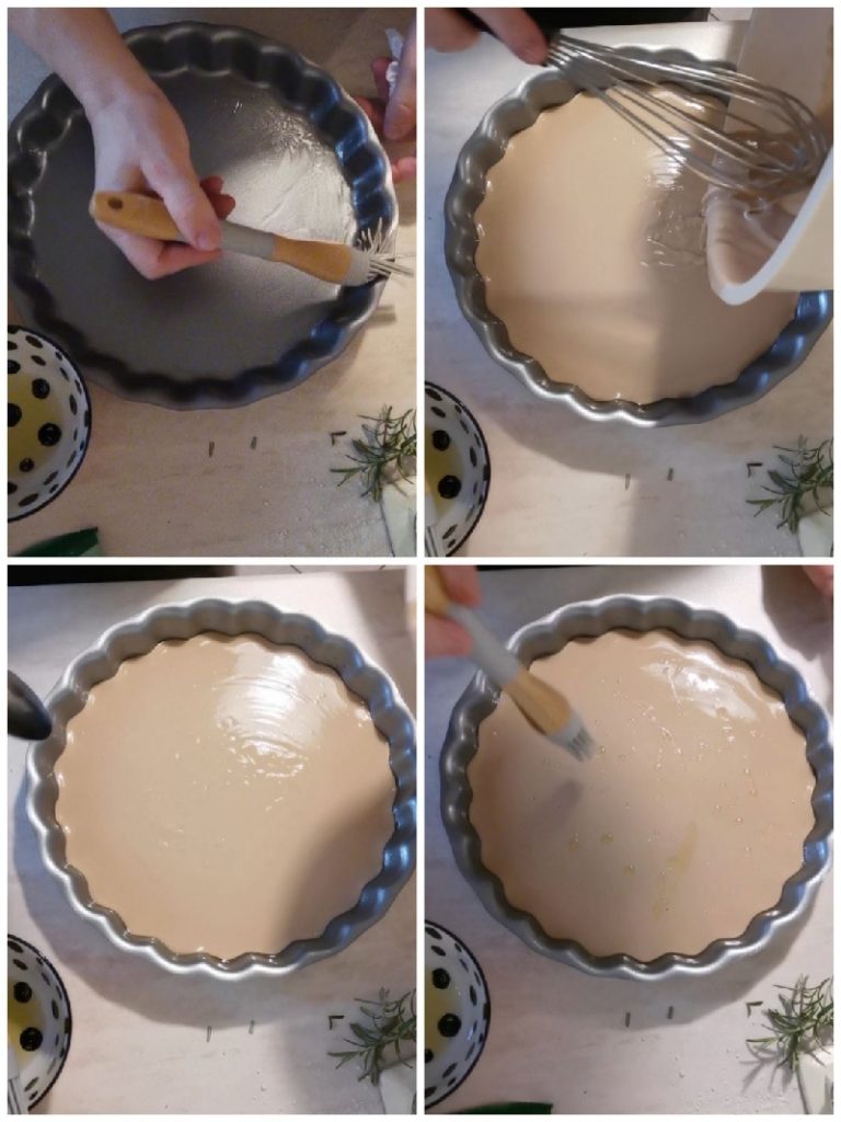 In eine mit Olivenöl bestrichene Backform den Teig geben, der etwa 2 cm hoch sein sollte. Die Oberfläche des Kuchens mit Öl bestreichen und im vorgeheizten Ofen bei 180° etwa 15 Minuten backen. Dann herausnehmen und die Oberfläche mit den restlichen Rosinen, den restlichen Pinienkernen und der Hälfte des gehackten Rosmarins bestreuen. Weitere 15 Minuten backen. Die Oberfläche des Kuchens sollte hell, leicht rissig, nicht verbrannt sein