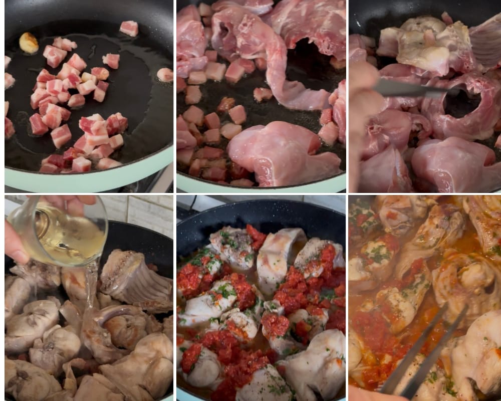 • Wir schneiden den Pancetta in Würfel und lassen ihn in einem Topf mit etwas Öl anbraten, fügen die Kaninchenstücke hinzu, und lassen sie von allen Seiten goldbraun werden. Dann fügen wir den Wein hinzu und lassen ihn verdunsten, würzen mit Salz und Pfeffer und geben die Tomaten hinzu. Wir decken das Gefäß ab und lassen es bei schwacher Hitze 45 Minuten kochen.