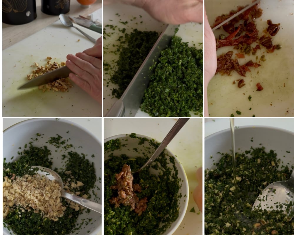 • Zehn Minuten vor dem Ende der Garzeit bereiten wir eine Sauce vor: Wir hacken die Petersilie mit dem Rosmarin, zerkleinern die Walnusskerne und reiben die Zitronenschale. Wir geben alle Zutaten in eine kleine Schüssel, gießen etwas Öl hinzu und würzen mit Salz und Pfeffer. Wir servieren das Kaninchen auf einer Servierplatte und begleiten es mit der Sauce und gegrillten Polentascheiben.