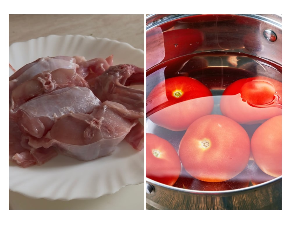 • Wir beginnen damit, das Kaninchen zu waschen. Wenn es ganz ist, schneiden wir es in Stücke und trocknen es gut ab. Wir blanchieren die Tomaten, entfernen dann die Haut und die Samen und schneiden sie fein.