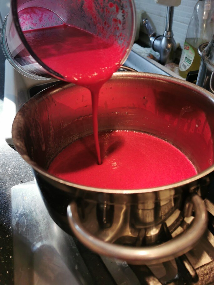 Wir beginnen mit der bereits gekochten roten Bete, schneiden sie in Stücke, geben sie in den Mixerbecher mit Honig, Muskatnuss, Ingwer und 200ml Milch und mixen, bis eine glatte und homogene Masse entsteht.
