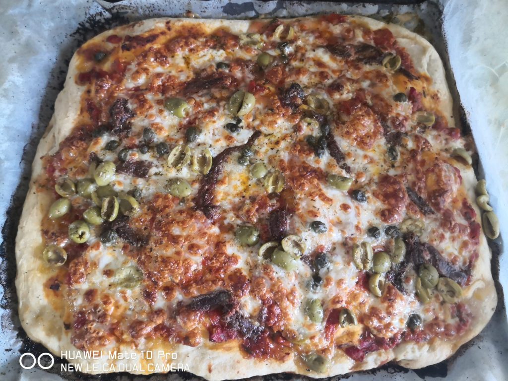 Sobald der Teig fertig ist, ihn auf einem gut bemehlten Brett mit den Händen ausrollen, dann auf ein mit Backpapier ausgelegtes, geöltes Backblech legen. Mit Tomaten belegen und im vorgeheizten Ofen bei 250° für 5 Minuten auf der unteren Schiene oder auf einem Pizzastein backen. Die Pizza aus dem Ofen nehmen, nach Belieben mit Mozzarella, Sardellen und mehr belegen, erneut auf der mittleren Schiene für 15 Minuten backen