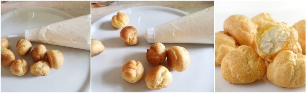 • Sobald die Windbeutel abgekühlt sind, können wir sie füllen. Wir nehmen einen Spritzbeutel mit kleiner, glatter Düse, das Loch muss klein sein, um den Boden des Windbeutels zu durchbohren und ihn mit der Spritze zu füllen, füllen Sie alle Windbeutel. Dann legen Sie die Windbeutel auf die Servierplatte und gießen die Glasur direkt über die Windbeutel, und voilà, die Profiteroles sind servierfertig.