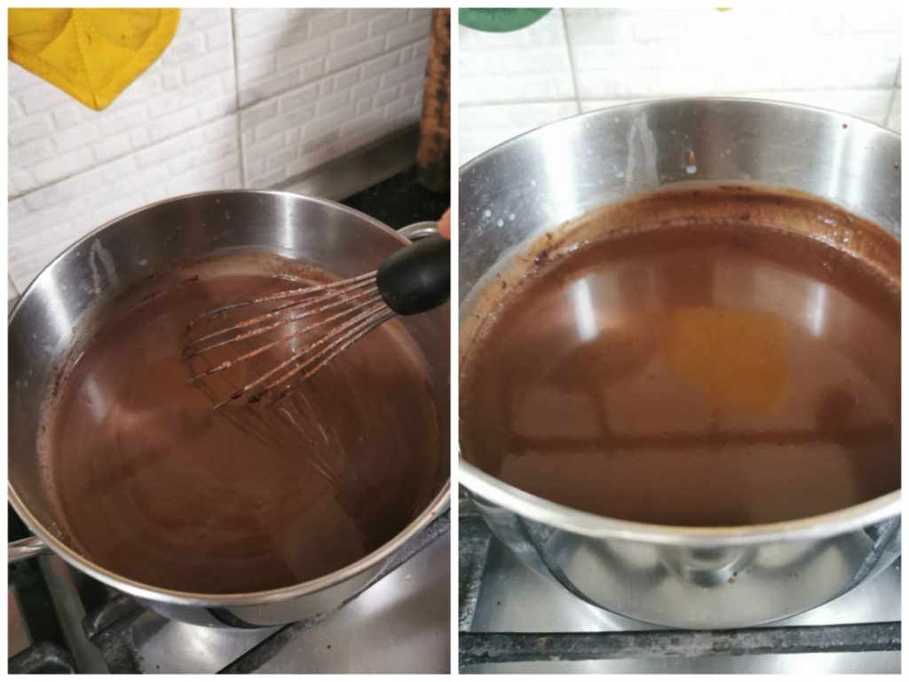 • In einem hohen Kochtopf Wasser, Zucker und Sahne erhitzen. Zum Kochen bringen, bis sich der Zucker aufgelöst hat, vom Herd nehmen und die Schokolade in Stücken hinzufügen. Mit einem Handrührbesen rühren, bis eine glänzende Glasur entsteht. Lassen Sie sie etwas abkühlen und verwenden Sie sie auf den Windbeuteln