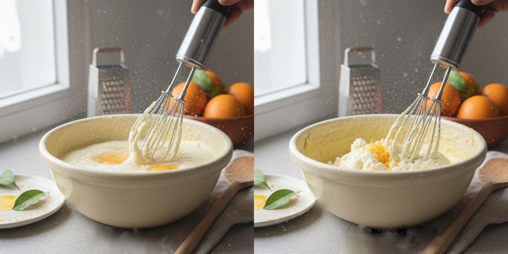 Füge die Aromen und den Ricotta hinzu: Gib die geriebene Orangenschale und den Ricotta löffelweise hinzu, während du bei niedriger Geschwindigkeit weiter rührst, um ihn gleichmäßig einzuarbeiten.