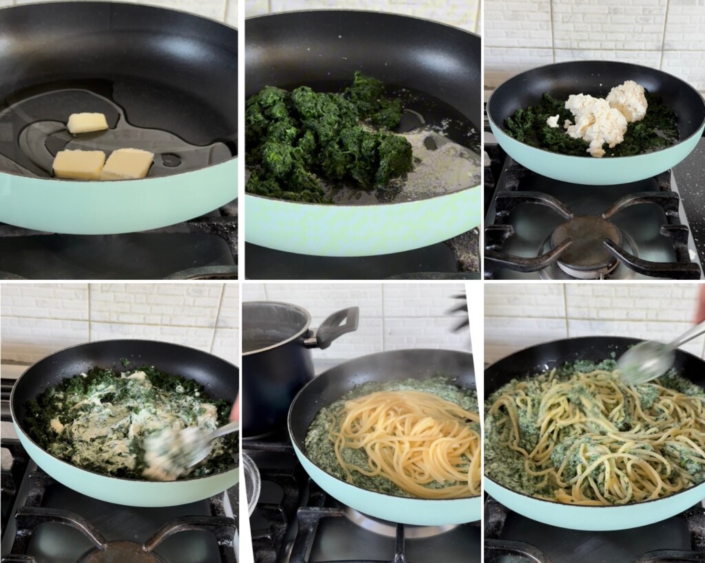 Bereite den Spinat vor: Wasche den frischen Spinat und koche ihn in wenig gesalzenem Wasser für ein paar Minuten, bis er zusammenfällt. Gieße ihn ab, drücke ihn sehr gut aus, um überschüssiges Wasser zu entfernen (das ist entscheidend!) und hacke ihn grob mit einem Messer. Wenn du gefrorenen Spinat verwendest, koche ihn nach den Anweisungen, gieße ihn ab und drücke ihn gut aus. Inzwischen die Pasta nach den Anweisungen auf der Packung kochen.