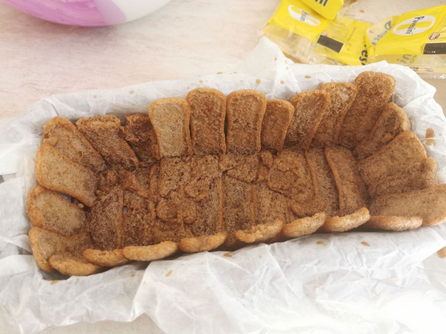 • Legen Sie eine Kastenform mit Backpapier aus. Mit den im Kaffee getränkten Pavesini legen Sie die Form aus (Boden und Seiten).