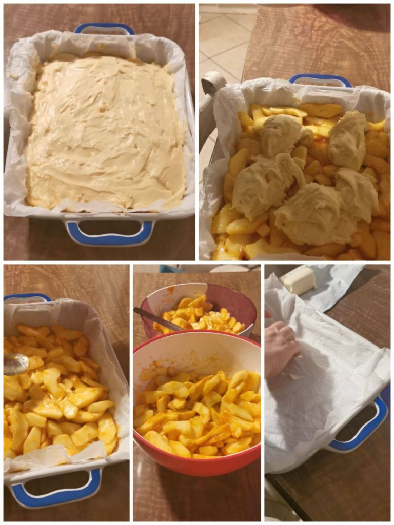 Wir legen eine Backform, ca. 26 cm, mit Backpapier aus. Auf den Boden geben wir die zuvor geschmolzene Butter und den braunen Zucker, fügen wir die Äpfel zufällig hinzu, darüber gießen wir den Teig des Kuchens. Verteilen Sie ihn gut über die Äpfel, bis sie bedeckt sind. Bei 180° für 45 Minuten backen. Sobald er fertig ist, lassen Sie ihn abkühlen, dann drehen Sie ihn auf einen Tortenteller um. Guten Appetit