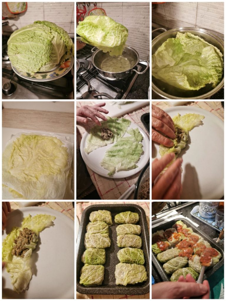 • Die Wirsingblätter waschen und in Salzwasser blanchieren, abtropfen lassen und die Adern entfernen. Leicht mit einem Fleischklopfer platt drücken, mit der Füllung füllen, zu einer Rolle formen und in eine leicht geölte Auflaufform geben, die Verzolini mit 3 oder 4 Esslöffeln Tomatensauce, einem Schuss Öl und einer Prise Grana bedecken. Im Ofen bei 180° gratinieren bis eine leichte Kruste entsteht. Heiß servieren, guten Appetit