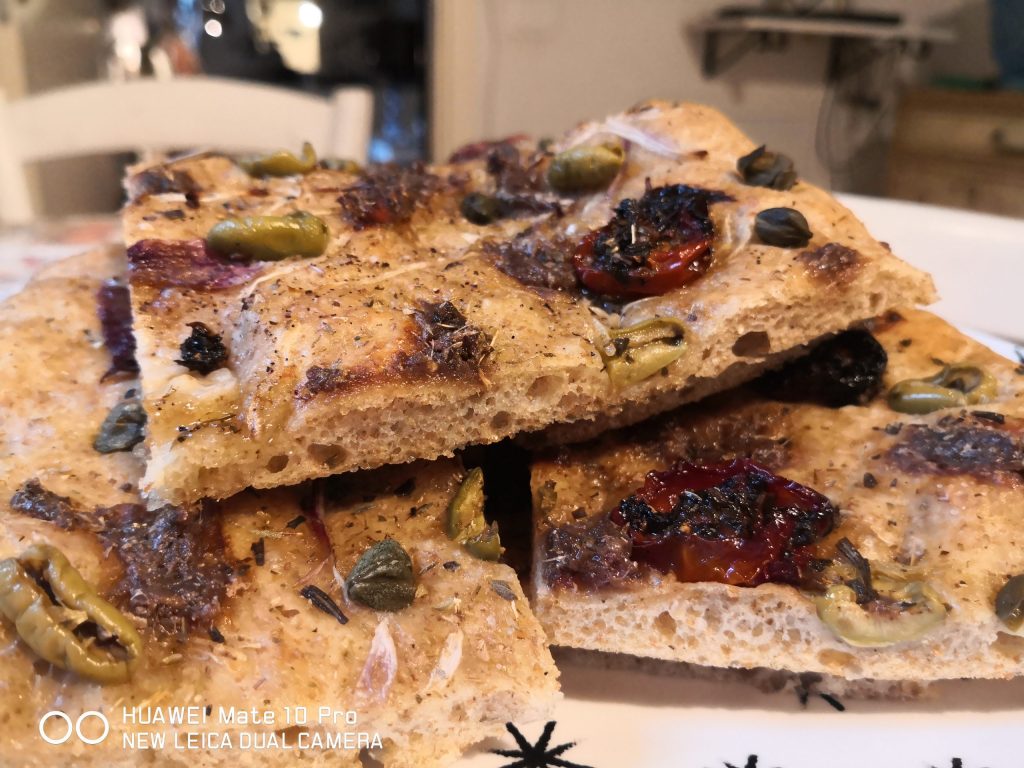 Dann beginnen wir, die Focaccia zu belegen. Ich habe die gesamte Oberfläche mit Kapern, Oliven, Anchovis belegt, dann habe ich auf einer Hälfte dünn geschnittene Zwiebeln aus Tropea und auf der anderen Hälfte Kirschtomaten confit, Salz, Pfeffer und Olivenöl extra vergine hinzugefügt. Schließlich die Oberfläche mit etwas Wasser besprühen.