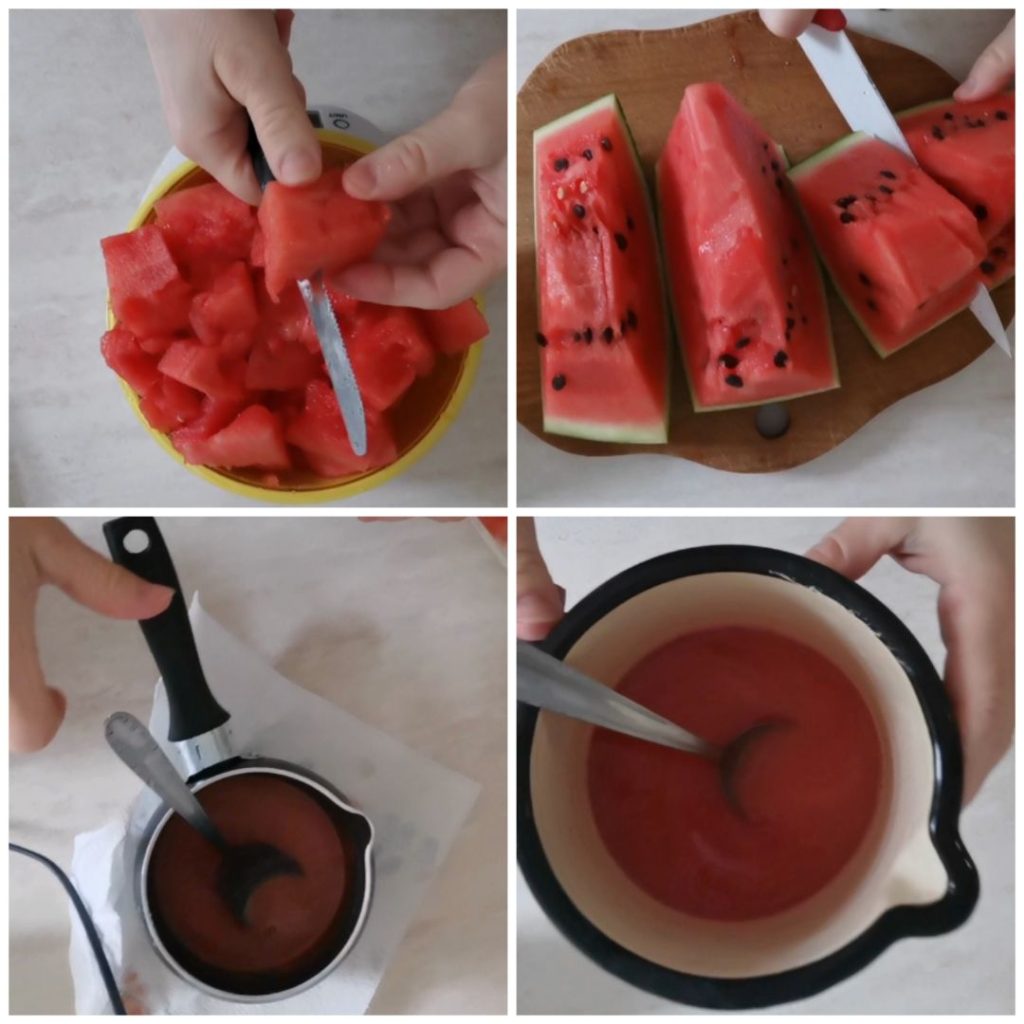 • Die restliche Gelatine einweichen und ausdrücken, in einer Schüssel. Das Fruchtfleisch der Wassermelone würfeln, die Samen entfernen. In den Mixer (wenn Sie am Kauf interessiert sind, klicken Sie hier) geben und bei mittlerer Geschwindigkeit pürieren, bis eine Masse entsteht; durch ein Sieb passieren. 3 Esslöffel in einem Topf erhitzen und die Gelatine darin auflösen, dabei mit einem Löffel umrühren, dann die Masse zur Fruchtmasse geben