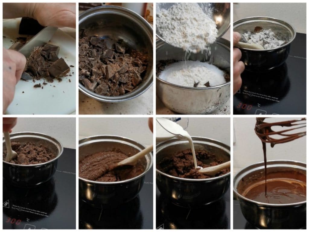 Nun bereiten wir die Schokoladencreme zu. Die Schokolade in Stücke hacken, in einen Topf geben, zusammen mit dem Zucker und dem Mehl mischen. Bei niedriger Hitze unter ständigem Rühren erhitzen, in wenigen Sekunden beginnt die Schokoladenmasse, sich zu einer weichen Kugel zu verdicken. Gießen Sie nach und nach die Sahne hinzu, während Sie weiterrühren. Fügen Sie keine weitere Sahne hinzu, bevor die vorherige vollständig aufgesogen ist. Fahren Sie so fort, bis die Sahne vollständig aufgebraucht ist
