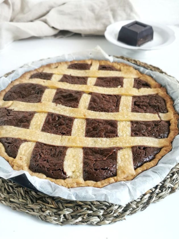 Wir montieren den Kuchen. Beginnen Sie damit, den Mürbeteig mit dem bemehlten Nudelholz auf dem Backpapier auf eine Dicke von 4 mm auszurollen. Legen Sie das Backpapier mit dem Teig in eine Tortenform, drücken Sie die Ränder gut an die Form und entfernen Sie den überschüssigen Mürbeteig mit einem Messer. Den restlichen Mürbeteig wieder in den Kühlschrank stellen. Stechen Sie den Boden der Torte mit einer Gabel ein. Nehmen Sie die Creme, rühren Sie um, gießen Sie sie in den Mürbeteigboden, lassen Sie etwa 7 mm vom Rand frei, verteilen Sie die Schokolade gut auf der Oberfläche. Nehmen Sie den restlichen Teig, rollen Sie ihn aus und schneiden Sie 6/7 Streifen von etwa 1 cm, die wir zum Dekorieren des Kuchens verwenden. Entfernen Sie den überschüssigen Teig. Stellen Sie den Kuchen für ca. 15 Minuten in den Kühlschrank.