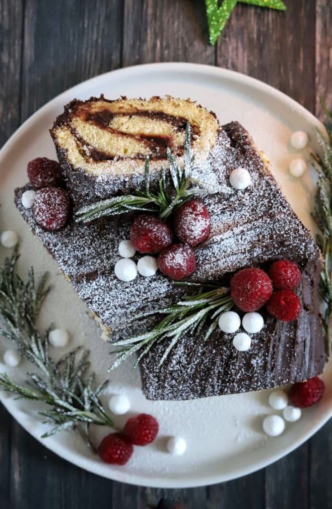 Jetzt können Sie die Johannisbeeren in die Ecke des Stammes geben und nach Belieben Rosmarinzweige verteilen, mit Puderzucker bestäuben. Die Weihnachtsbuche (Bûche de Noël) ist fertig