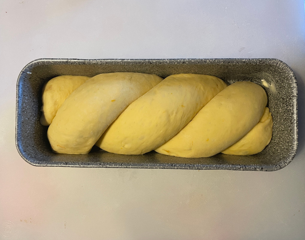 Sobald es gegangen ist, bestreicht die Oberfläche mit dem Eigelb, vermischt mit der Milch; wer mag, kann etwas Zuckerstreusel darübergeben. Backt im vorgeheizten Backofen (Ober-/Unterhitze) bei 170 °C für etwa 45 Minuten. Sollte die Oberfläche zu dunkel werden, deckt das Gebäck während des Backens mit Alufolie ab.
