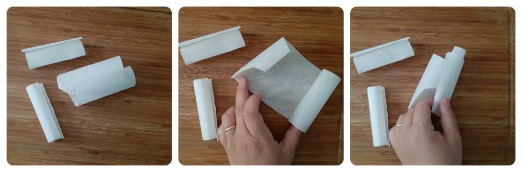 • Schneiden Sie die aufgerollten Backpapierstücke zuerst in der Mitte und dann nochmals in der Mitte, um 8 Röhrchen zu erhalten.