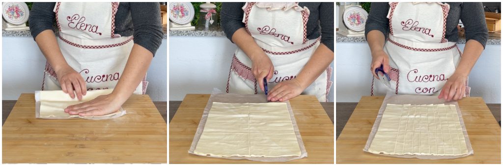 Schneiden Sie das Blätterteigrechteck in Streifen von etwa 1 cm Breite, der Länge nach.