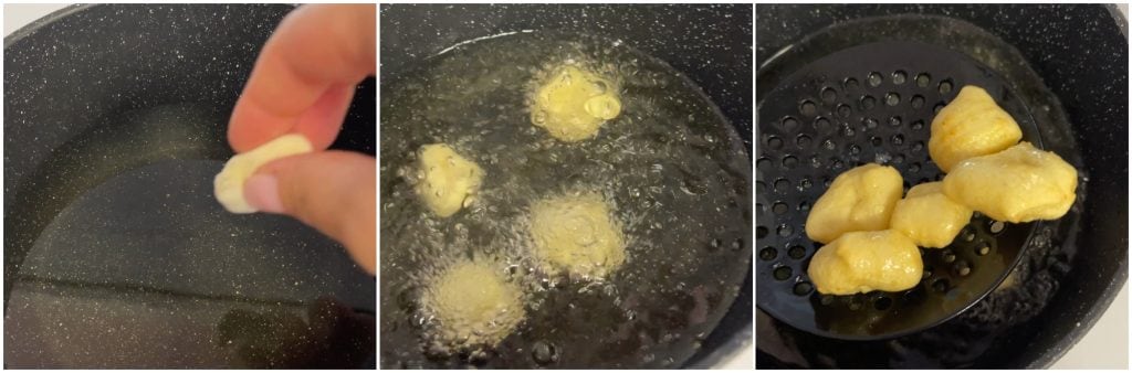 Wenn das Öl heiß ist, geben Sie die Kartoffelgnocchi nacheinander hinein.