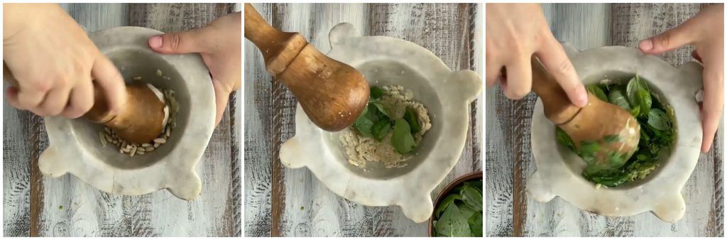 Sie können entscheiden, ob Sie alle Zutaten in den Mixer geben oder das Pesto genovese im Mörser nach meinem folgenden Rezept mit Schritt-für-Schritt-Fotos zubereiten möchten.
