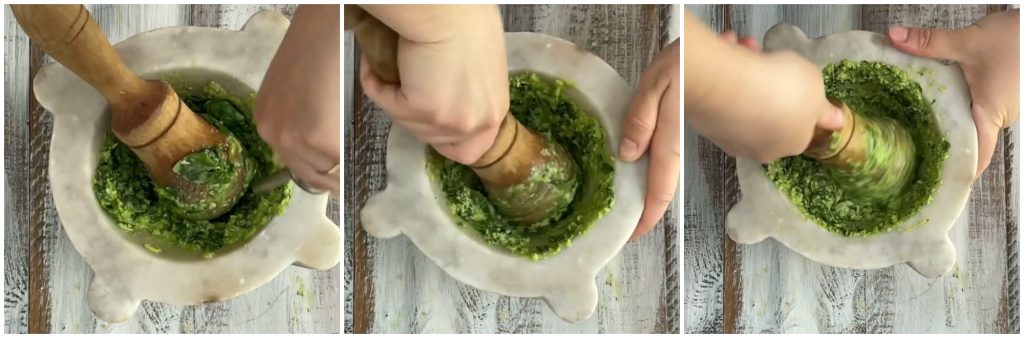 Fügt in den Mörser die Basilikumblätter hinzu und zerdrückt (oder mixt).