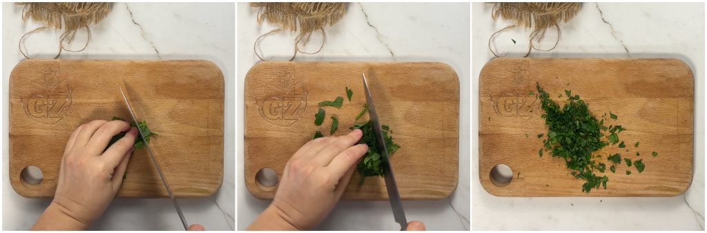 • Waschen und putzen Sie die Petersilie, hacken Sie sie anschließend sehr fein mit dem Messer oder dem Wiegemesser und stellen Sie sie beiseite.