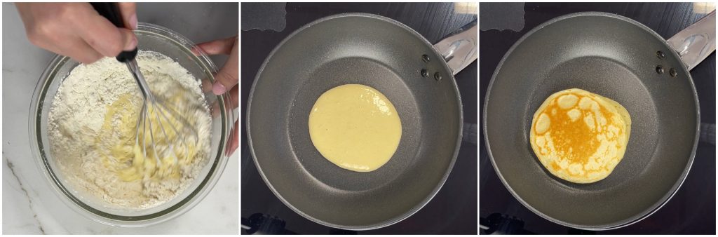 Wenn die Pfanne heiß ist, geben Sie eine Schöpfkelle des Teigs in die Mitte der Pfanne.