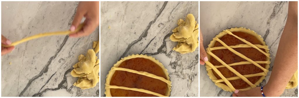 Pfirsichmarmeladenkuchen der klassische Kuchen meiner Kindheit, zubereitet mit meinem unfehlbaren Mürbeteig und mit der Marmelade, oder besser gesagt, der Pfirsichkonfitüre, die ich streng mit den Pfirsichen von den Bäumen meines Vaters zubereitet habe.