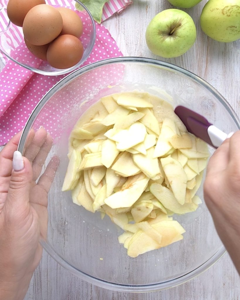 • Zuerst die Äpfel schälen und in sehr dünne Scheiben schneiden.