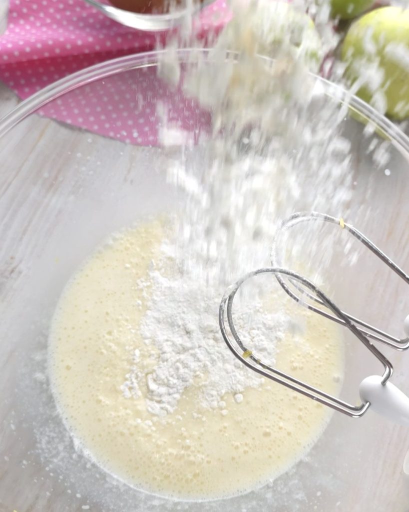 • Die geschmolzene Butter, die Milch, das Mehl und das Backpulver dazugeben, bis eine glatte und homogene Masse entsteht.