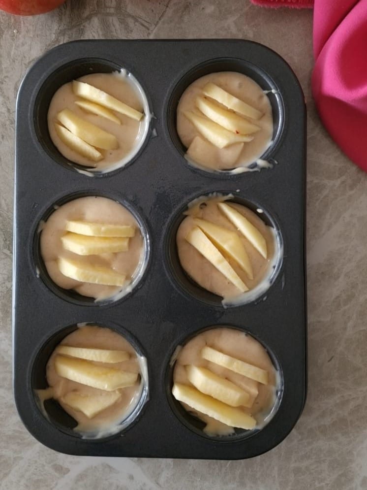 Die restlichen Apfelstücke in Scheiben schneiden, mit einer Prise Zucker bestreuen und die Muffins damit dekorieren. Dann im statischen Ofen etwa 15 Minuten backen.