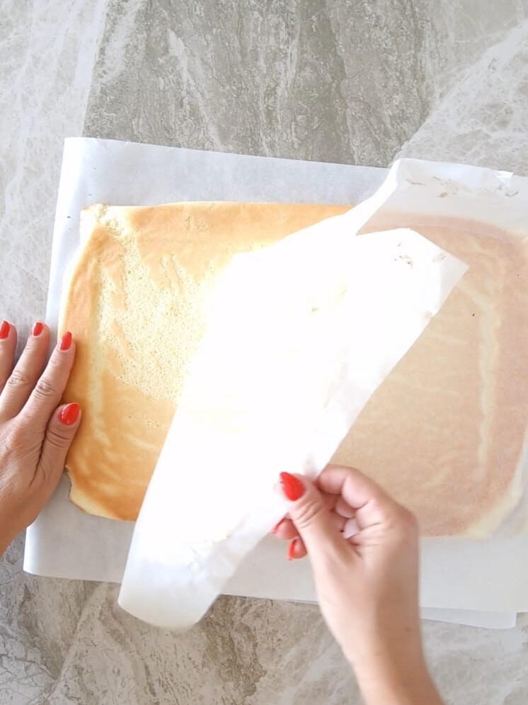 Nach der Backzeit die Biskuitrolle sofort von der Backform nehmen und auf ein anderes Backpapier umdrehen. Dann entfernen und die Biskuitrolle aufrollen, anschließend vollständig abkühlen lassen, während sie aufgerollt ist.