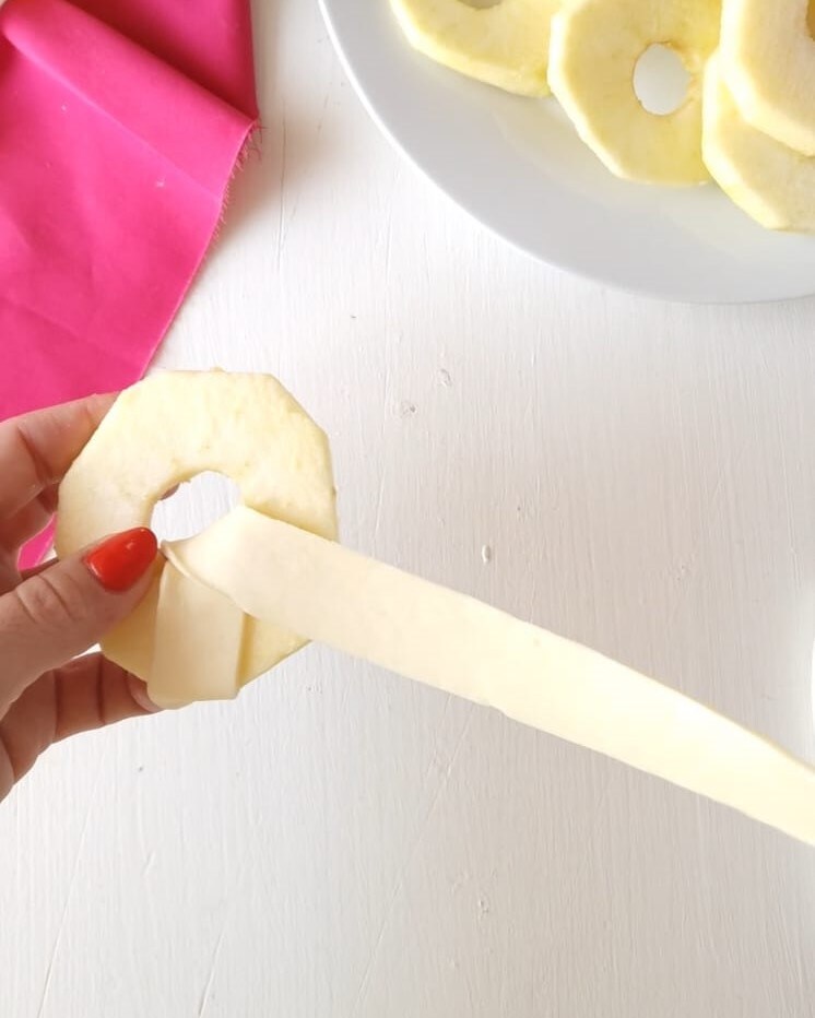 Nun schneiden Sie Apfelscheiben und wickeln einen Streifen um jede Apfelscheibe, wie auf dem Foto zu sehen.