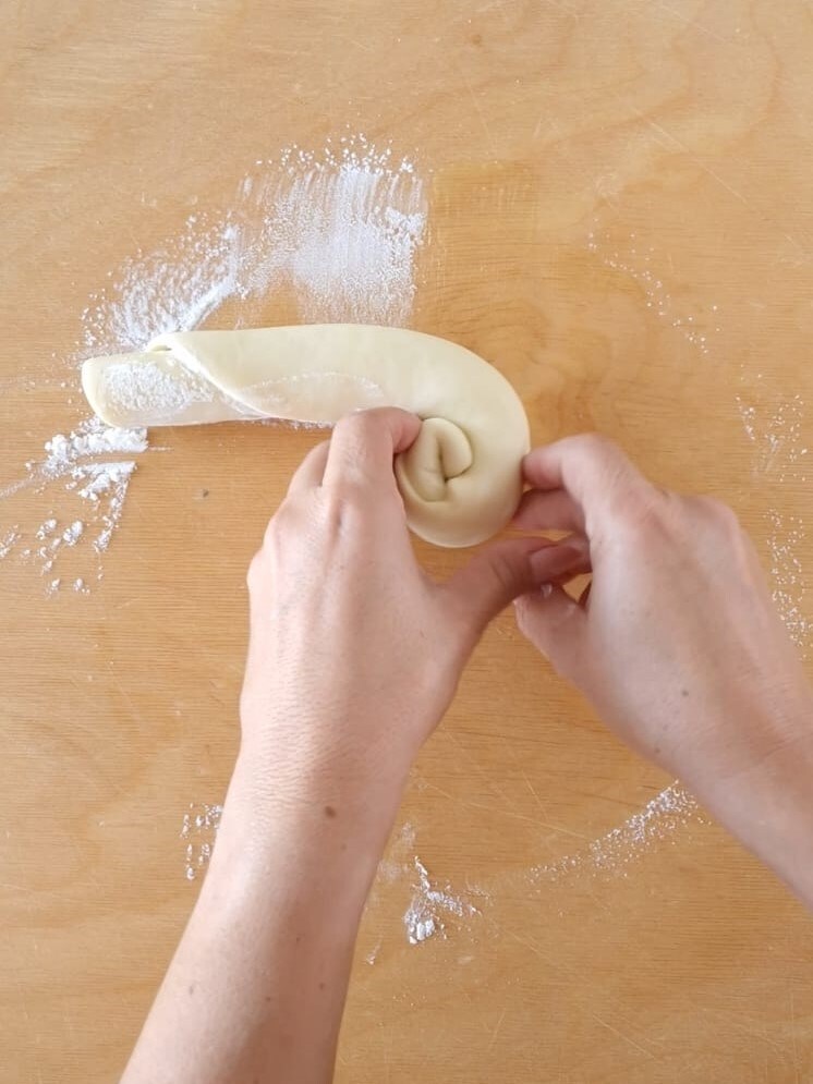 • An diesem Punkt rollen Sie den Teig zu einem Strang auf, dann rollen Sie ihn zu einer Schnecke,