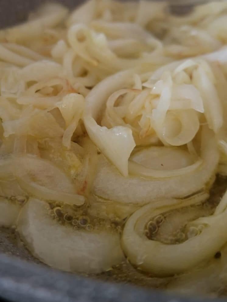 • Schneiden Sie die Zwiebel in Scheiben, lassen Sie sie mit einem Schuss Öl in der Pfanne weich werden.