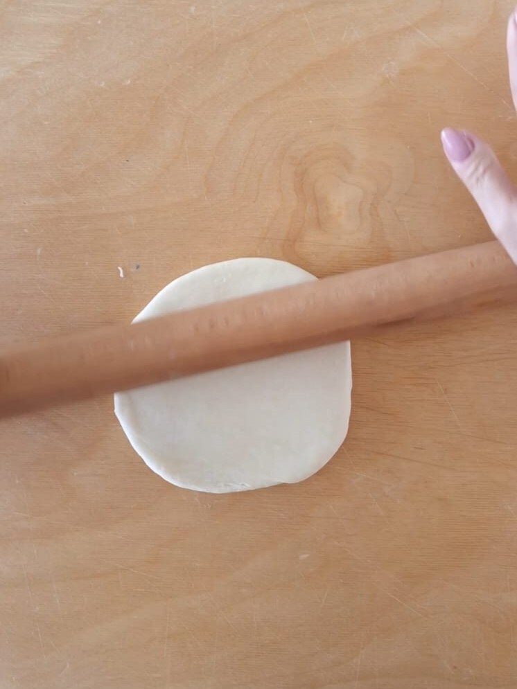 • Nach der Ruhezeit den Teig in 6 Teile teilen, dann mit einem Nudelholz ausrollen.