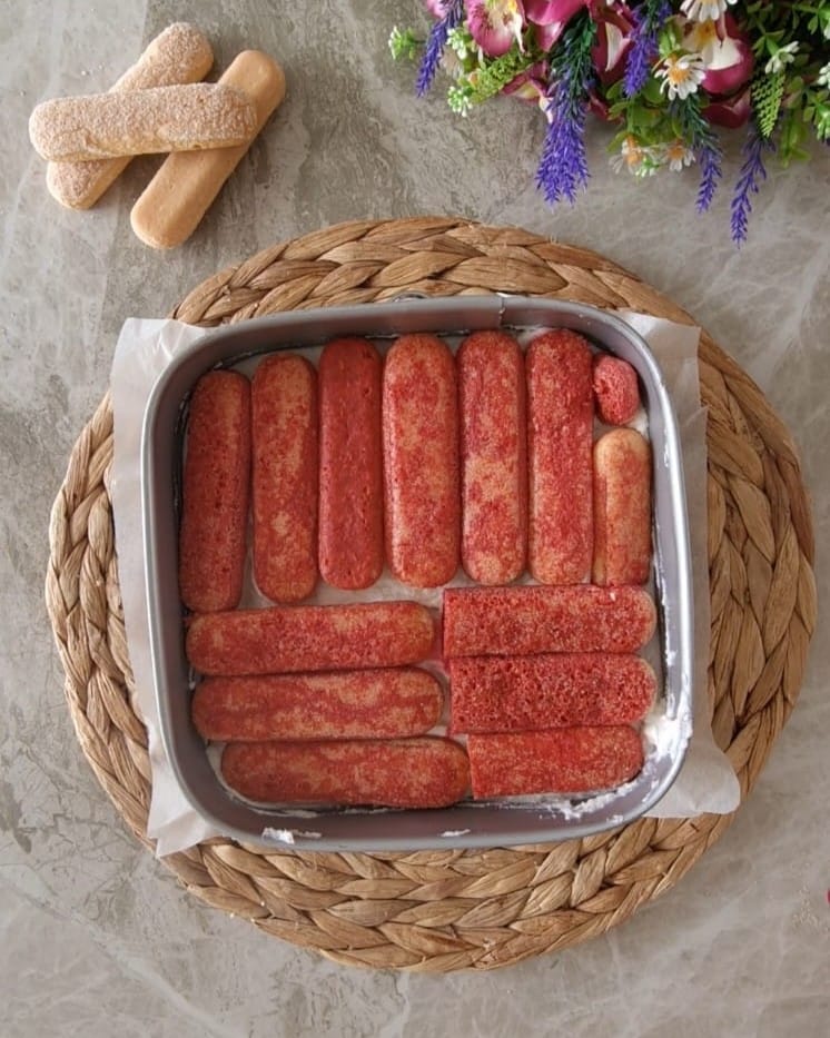 Eine Schicht in Alchermes getränkte Löffelbiskuits legen.