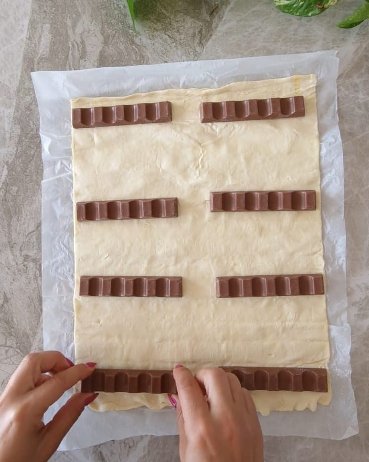 Jedes Stück nehmen und die Schokoladenriegel in den Blätterteig einwickeln.