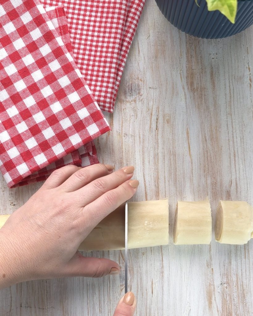 Nach der Ruhezeit die Rolle vorsichtig in Scheiben von etwa 1,5/2 cm schneiden. Nehmen Sie jede Scheibe und drücken Sie mit den Händen von der Mitte nach außen, um eine Vertiefung zu schaffen.