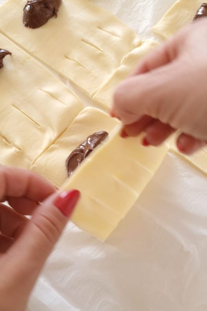 Auf eine Hälfte jedes Rechtecks geben Sie einen Esslöffel Nutella und verstreichen es ein wenig, ohne die andere Hälfte zu erreichen. Machen Sie dann 3 kleine Schnitte auf der gegenüberliegenden Seite.