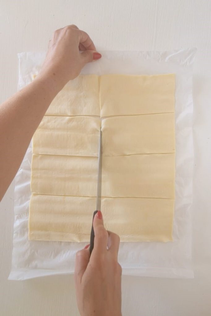 Rollen Sie den Blätterteig aus, dann schneiden Sie mit einem Messer den Teig in 8 Rechtecke;