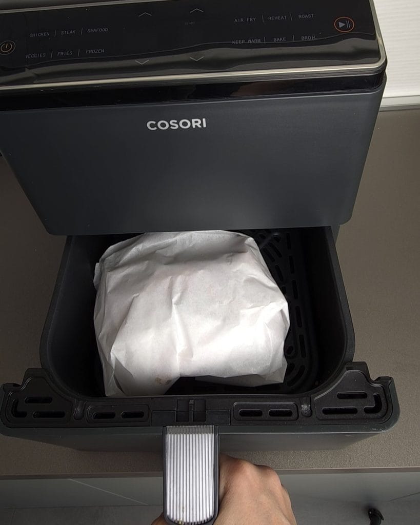 An diesem Punkt das Fleisch in das Backpapier wickeln, ein Päckchen formen und in der Heißluftfritteuse bei 180°C für 40-45 Minuten garen.