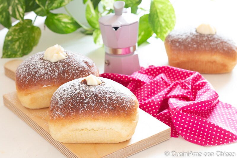 Nehmen Sie sie aus der Form und bestreichen Sie sie dreimal mit Milch, stellen Sie dabei sicher, dass die Milch vor dem zweiten und dritten Mal gut absorbiert ist, während sie noch warm sind: Dieser Schritt sorgt für eine weiche und glänzende Kruste. Wenn sie abgekühlt sind, schneiden Sie mit einer Schere einen kleinen Schnitt in die Mitte und füllen Sie sie mit einer Spritztüte mit dem, was Sie bevorzugen.