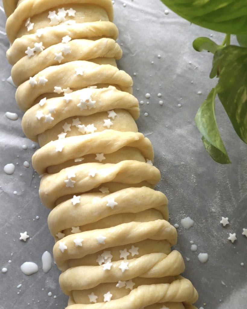 Bestreichen Sie die Oberfläche mit Milch und dekorieren Sie mit Zuckerstreuseln. Lassen Sie es in einer mit Backpapier ausgelegten Form 20 Minuten unter Folie ruhen. Nach der Ruhezeit auf der unteren Schiene im vorgeheizten Ofen im statischen Modus bei 180°C etwa 25 Minuten backen. Wenn es zu stark bräunt, decken Sie es mit Alufolie ab.