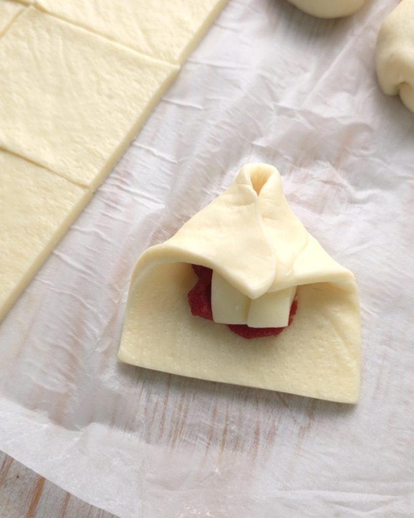 • Jedes Stück mit Tomatenmark und Käse füllen und verschließen.