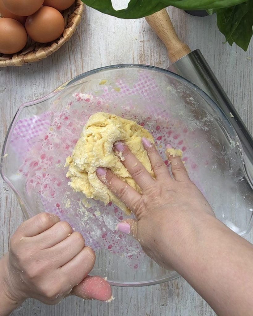 Alles gut vermischen, dann einen Ball formen und ihn in Frischhaltefolie eingewickelt eine Stunde im Kühlschrank ruhen lassen.