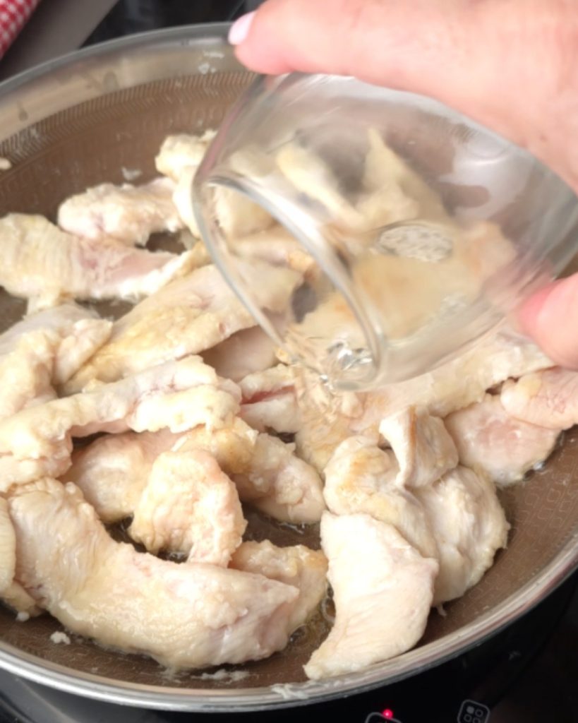 • Gebt die Streifen in die Pfanne und bratet sie gut an, löscht dann mit Wein ab und schmeckt mit Salz und Pfeffer ab.