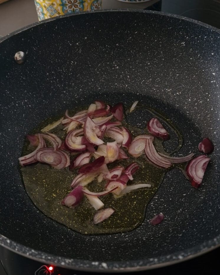 • Schneiden Sie das Gemüse in Stücke und braten Sie es dann in der Pfanne mit der fein geschnittenen Zwiebel und einem Schuss Olivenöl extra vergine an.