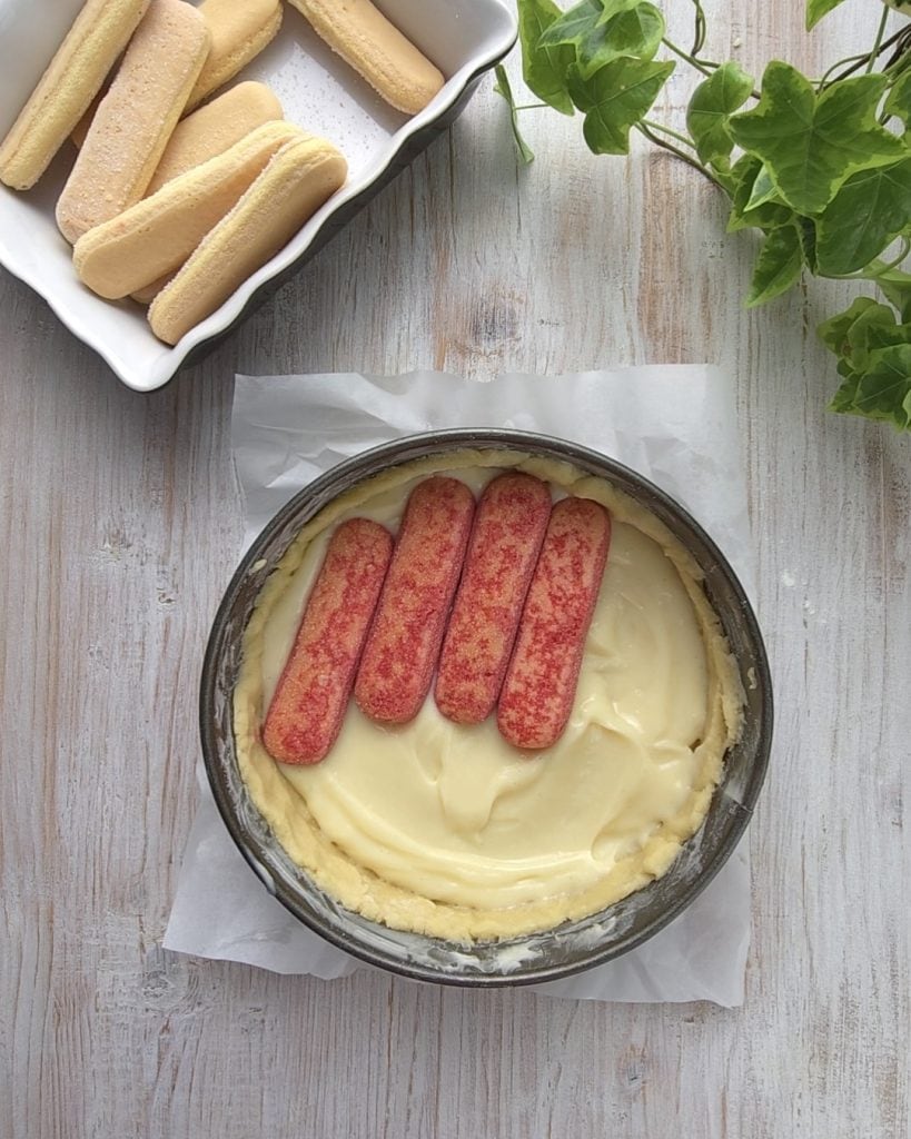 Mit Creme füllen und dann die Kekse im Alchermes tränken und auf die Creme legen, um die gesamte Oberfläche zu bedecken.